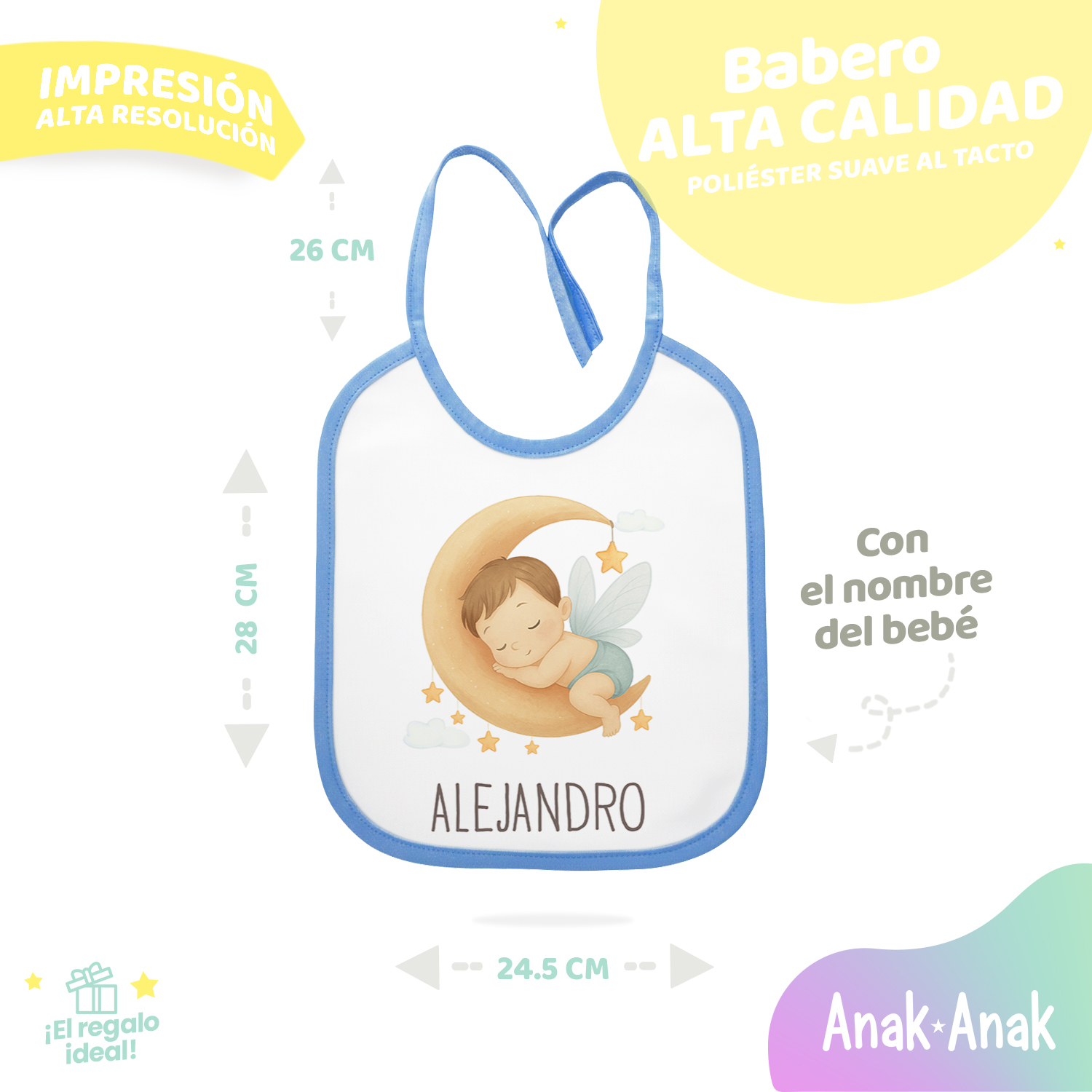 Cada Babero Personalizado Hada Niño se elabora cuidadosamente para ofrecerte un producto único. Solo tienes que indicar el nombre del bebé y nuestro equipo lo imprimirá con mimo. Es el regalo perfecto para nacimientos, baby showers o para sorprender a nuevos papás con un detalle original y funcional, porque se convertirá en un imprescindible en las cosas del bebé.