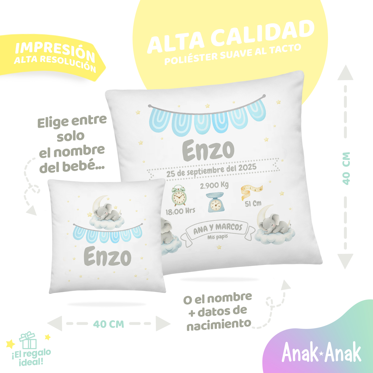Celebra la llegada de tu bebé con ternura y estilo con este precioso Cojín Natalicio Elefante. Un detalle único y lleno de significado que guarda los datos más importantes del nacimiento de tu pequeño: nombre, fecha, peso, talla, hora y nombres de los papás. Su diseño delicado, con una dulce ilustración de elefantes y banderines en azul pastel, lo convierte en el recuerdo perfecto para toda la vida.