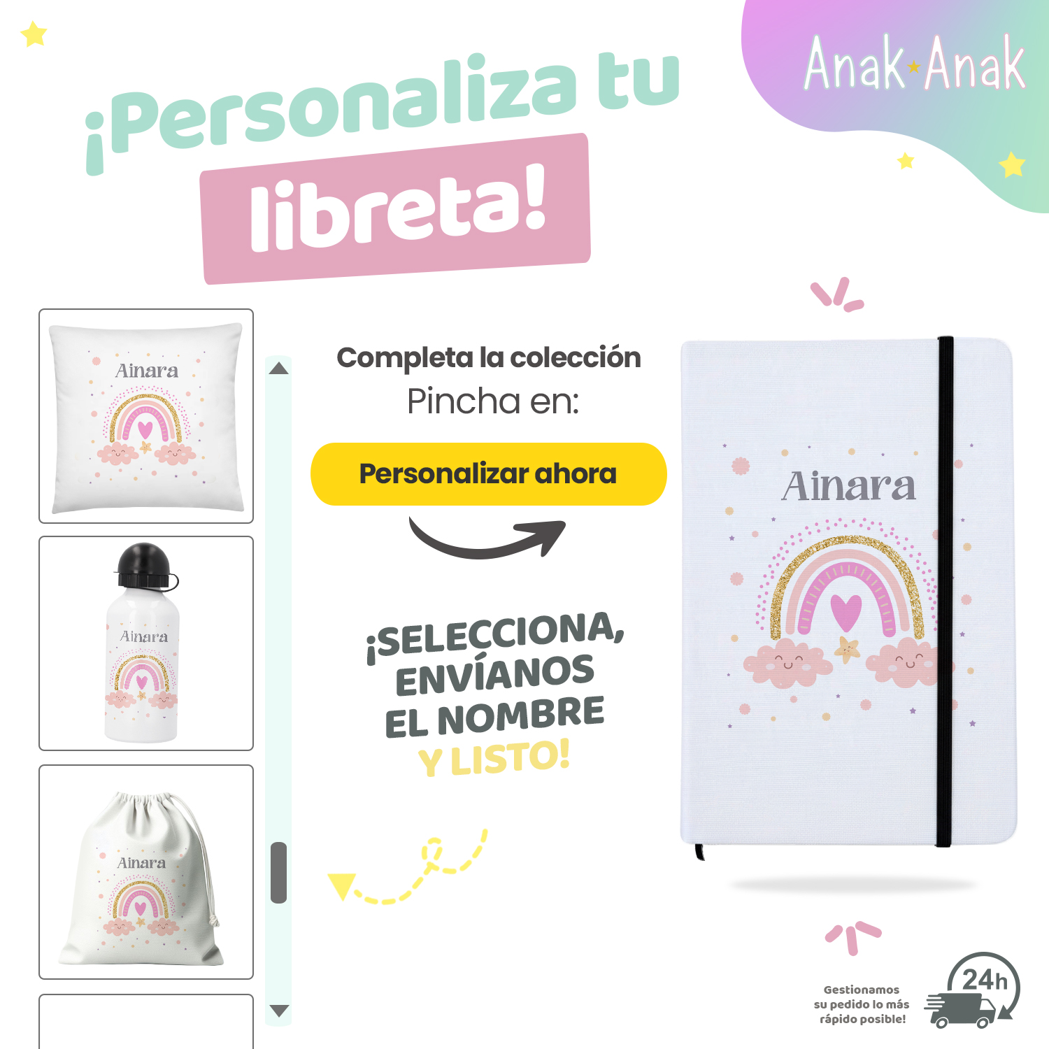 Cada Libreta Personalizada con nombre Arcoíris Rosa se crea especialmente para ti. Solo tienes que indicar el nombre de la niña, y nuestro equipo lo imprimirá con mimo en la portada. Es un detalle único que encantará tanto a pequeños como a mayores, ideal para cumpleaños, regreso a clases o como obsequio original.