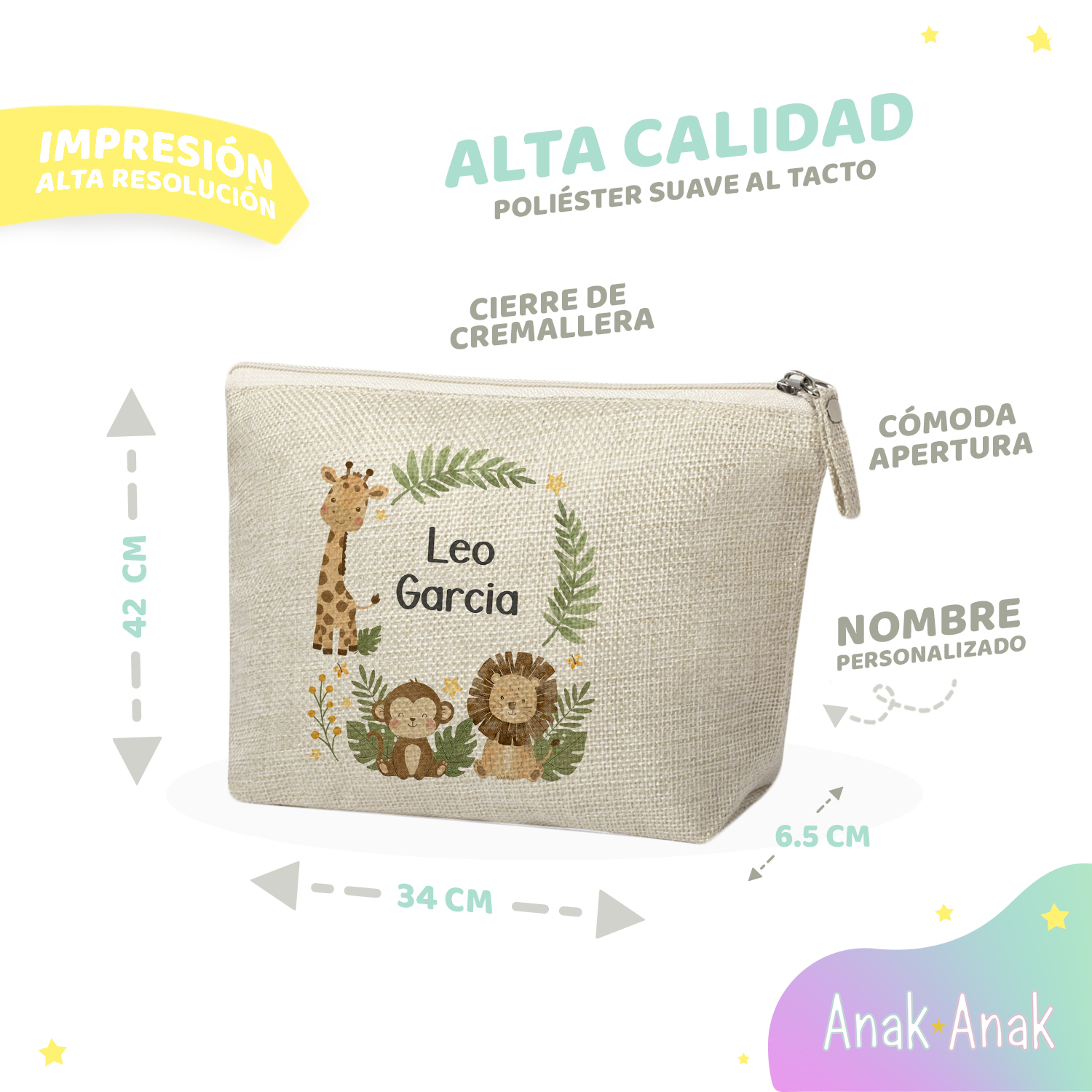 Cada Neceser Personalizado con Nombre Animales de la Selva se fabrica especialmente para ti. Solo tienes que indicar el nombre de la niña, y nuestro equipo lo imprimirá con mimo y precisión. Es un regalo perfecto para cumpleaños, la vuelta al cole o como detalle práctico para guardar artículos de higiene, maquillaje infantil, juguetes pequeños o material escolar.