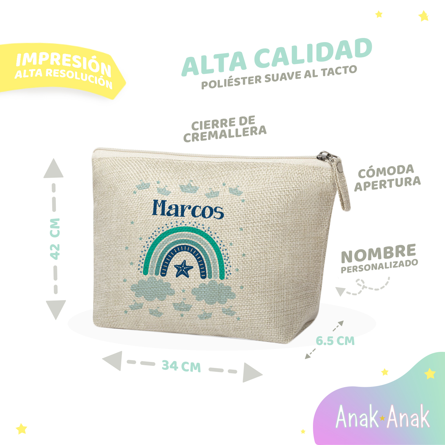 Cada Neceser Personalizado con Nombre Arcoíris Azul se fabrica especialmente para ti. Solo tienes que indicar el nombre de la niña, y nuestro equipo lo imprimirá con mimo y precisión. Es un regalo perfecto para cumpleaños, la vuelta al cole o como detalle práctico para guardar artículos de higiene, maquillaje infantil, juguetes pequeños o material escolar.