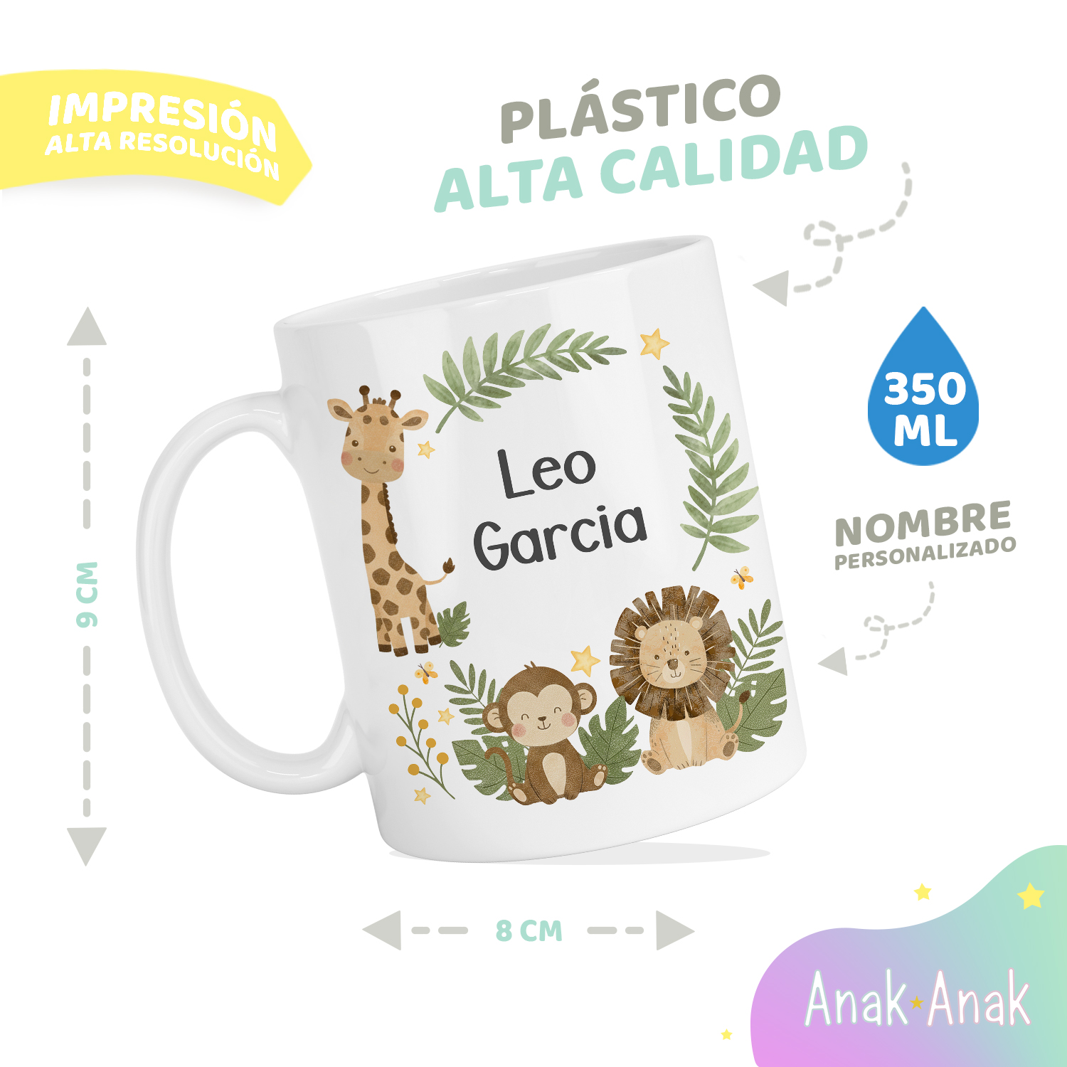 ¡Sorprende a los más pequeños de la casa, con esta taza personalizada Animales de la Selva! le sacará una sonrisa cada vez que la use. Pues, su dibujo es muy chulo, divertido y además, lleva su nombre grabado en ella. Siendo ideales como regalo para cumpleaños, vuelta al cole, caminatas por el parque… o cualquier otra ocasión.